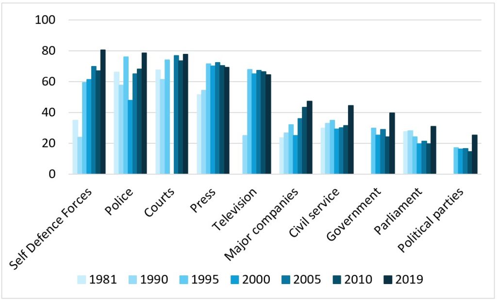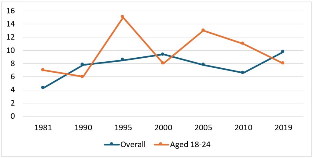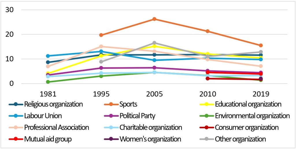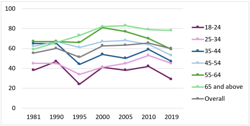 This section examines social, political and postmaterialist values. Firstly, Table 1 shows that “privatization” is on the rise.[11] The overall proportion of respondents who consider family and leisure time important has increased, as has the proportion in the 18-24 and 25-34 age groups. Focusing on respondents choosing “very important”, the increase is more obvious: 62 percent in 1990 to 88 percent in 2019 for the 18-24 age group. The percentage of individuals within the same age group who say that leisure time is of significant importance increased from 47 percent in 1990 to 78 percent in 2019. In the case of politics, the proportion of people who consider politics as important has increased from 49 percent (1990) to 64 percent (2019), exceeding the majority. For the population aged 18-24 and 25-34, the importance of politics has increased by the same amount.