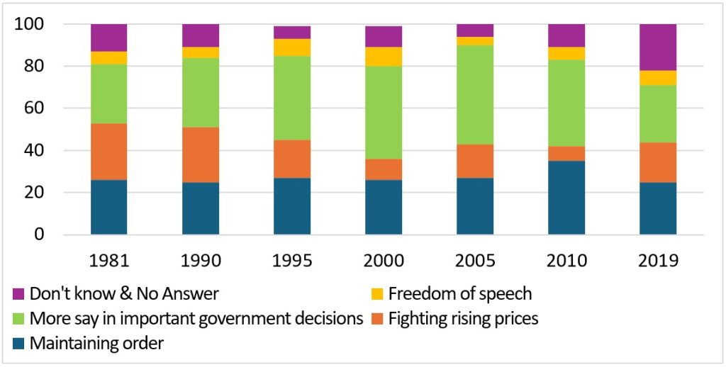 As for the postmaterialist index, the overall share of “postmaterialist” increased from 4.3 percent in 1981 to 9.4 percent in 2000,[12] which aligns with Watanuki’s (1994) findings. Later, however, it declines or fluctuates (represented by the blue line in Figure 1).[13] Figure 1 also shows that the percentage of “postmaterialist” among respondents aged 18 to 24 is as low in 2019 as it was in 1981 (represented by the orange line in Figure 1).[14] However, more people in this age group prioritize participation as the most important of the four items, although the proportion has declined since 2005 (Figure 2). Prioritizing participation over maintaining order and controlling prices has been unique to this age group since 1981.