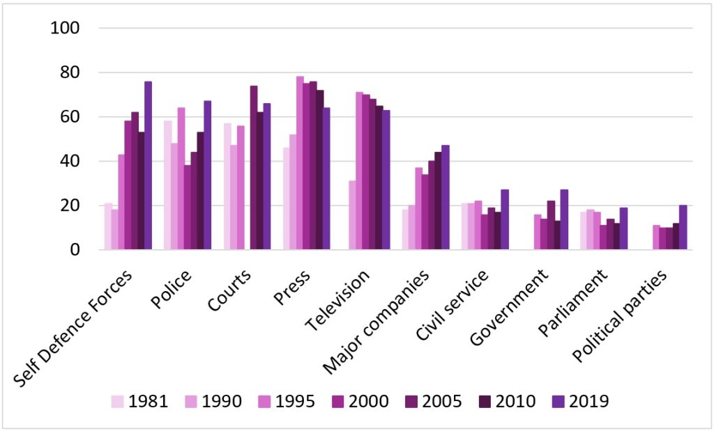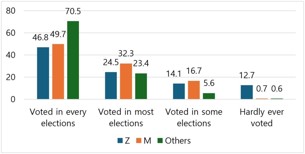 Recognizing the differences in the economic and social experiences of Millennials and Gen Z, the paper seeks to find any generational effects in their political participation through a brief analysis of the WVS. Following the existing literature, the political participation of Millennials and Gen Z is examined through their values, interests, trust and affiliation. The WVS has been conducted seven times from 1981 to 2019. Millennials and Gen Z are represented by the 18-24 and 25-34 age group in the 2019 survey.[9] Despite the absence of statistical analysis, the WVS provides a rough idea of the age, period, and cohort effects by comparing results within the same survey year and between different age groups as well as following the same birth cohort in different survey periods.[10]