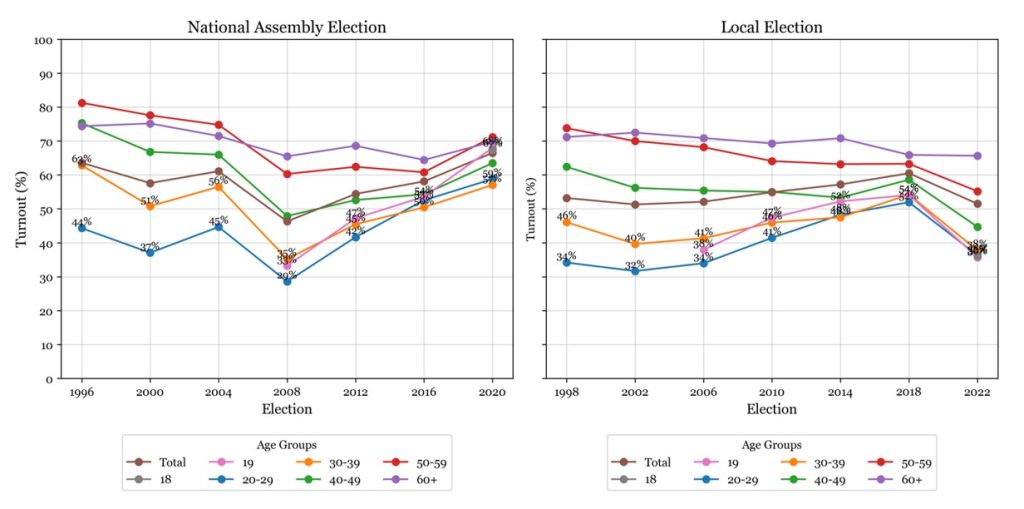 According to Kang, terms like “N-po Generation” and “Hell Joseon” reflect more than just economic hardship among Korean youth. They represent a fundamental shift in how young people understand their social and economic challenges. While previous generations held strong beliefs that individual hard work could lead to upward social mobility, today’s young people increasingly recognize their struggles as manifestations of deeper structural problems within Korean society. The systemic nature of these challenges suggests that effective solutions must necessarily involve political and policy changes, as individual efforts alone cannot address problems rooted in social structures, economic systems, and policy frameworks. The relationship between youth political participation and representation in Korea offers important insights into broader questions of democratic development. In South Korea, increasing political awareness and participation among young people, driven by recognition of structural challenges, has not automatically translated into greater descriptive representation. The divergent patterns between voting behavior and electoral success suggest that formal political participation alone may not be sufficient to ensure representation. Addressing the persistent underrepresentation of youth in Korean politics requires substantive institutional reforms in two key areas. First, the issue of the disparity in opportunities faced by young candidates in the nomination process must be addressed. Current quota systems remain largely advisory rather than mandatory. It is therefore necessary to develop consensus around quota systems while designing implementation methods that address concerns regarding fairness and minimize potential backlash. Equally important is the establishment of a sustainable youth political training pipeline. The current gap between the rise in youth voter participation and limited representation suggests that short-term nomination advantages are insufficient. Long-term investment in political education programs, internships in local councils, policy workshops, and participatory budgeting initiatives would create systematic pathways for youth engagement. This approach requires a shift in the recruitment strategies of political parties, moving from an external focus to an internal cultivation of future leaders through structured and inclusive mechanisms. These institutional reforms would require substantial support from civil society actors, who can both advocate for implementation and hold political parties accountable for achieving meaningful rather than symbolic change.