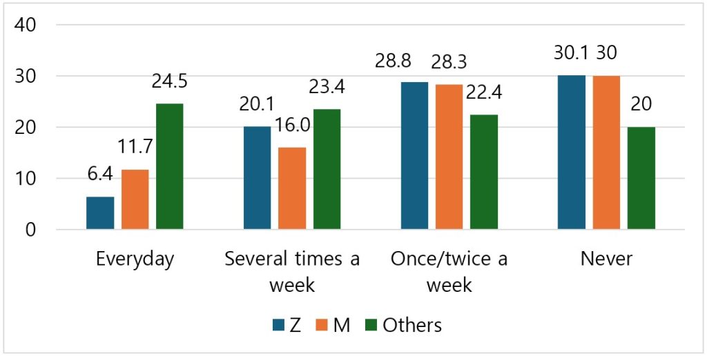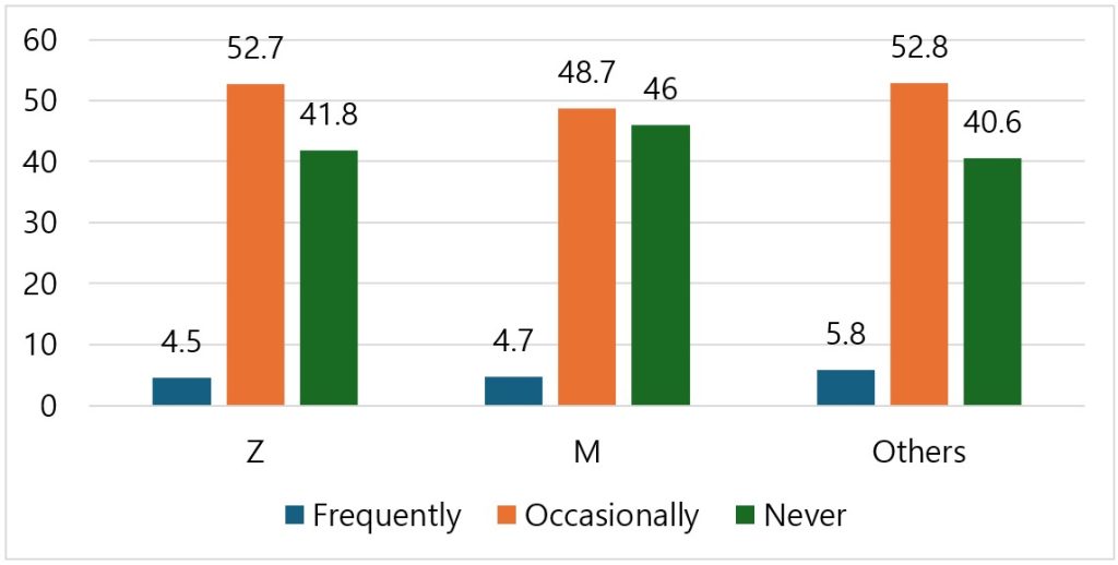 Economically, Millennials and Gen Z grew up during the so-called “lost three decades” or the thirty-year depression unlike rapid economic growth experienced by earlier generations. Socially, the period has been characterized as one of deepening social polarization. At the same time, the rapid development of digital technology is affecting Millennials and Gen Z. Demographically, Millennials account for 11 percent and Gen Z for 15.2 percent of the total population in 2024 (Statistics Bureau of Japan 2024).[8] Unlike previous birth cohorts that experienced two “baby booms”, the size of the populations is comparatively small.