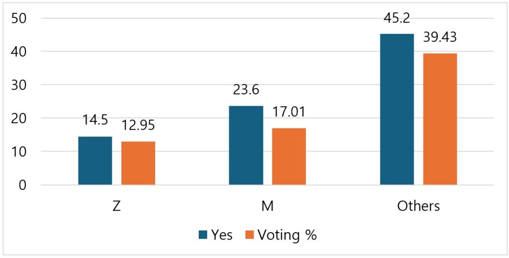 This section explores Millennials’ and Gen Z’ attention to politics. The percentage of people between the ages of 18 and 24 who respond they are interested in politics ranges from 35 to 45 percent (Figure 3).[15] As people age, they tend to develop a heightened interest. According to a separate survey conducted by the Japan Center for International Exchange (JCIE) in 2023, respondents in Japan between the ages of 18 and 39 identified two primary reasons for their lack of interest in politics: i) they do not have any expectations from politics, and ii) nothing will change even if they vote.[16]