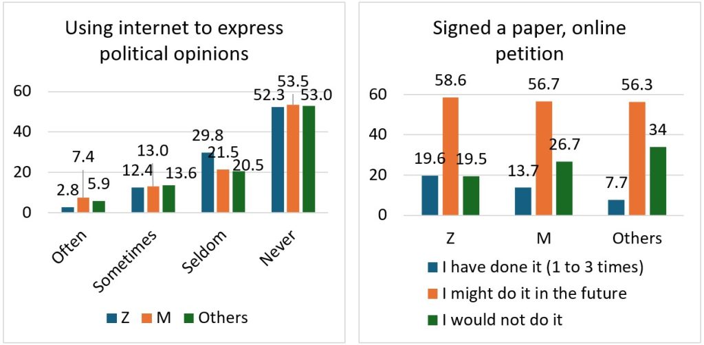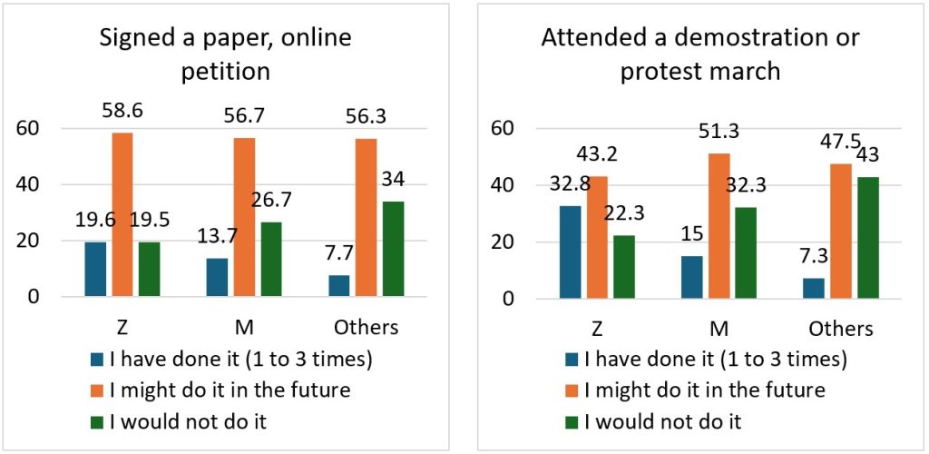 These media reports indicate a contrast in the impact of Millennials and Gen Z[3] on democracy[4]: The majority of them do not usually vote, yet when they do, it creates political phenomena. Why do some Millennials and Gen Z participate in politics while others do not? Is it because of their generation or do age and time influence their political participation? The overall aim of the joint research is to develop policy recommendations for government, political parties and NGOs to engage Millennials and Gen Z. To this end, this paper seeks to understand the political participation of these birth cohorts, with a focus on their values, interests, trust, and associability, which existing research suggests influence political participation and preferences (Inglehart 1971; Inoguchi 2002; Putnam et al. 1993). In doing so, the analysis clarifies the differences between age, period, and generational effects on political behavior (Braungart and Braungart 1986; Mifune and Nakamura 2009; Watanuki 1994). Through a brief review of the results of the World Values Survey (WVS), this paper argues that the political participation of Millennials and Gen Z appears to be similar to that of older generations when they were young, i.e., there is little generational effect. Most of the observed changes in their values, interests, trust and affiliation are identical to those of the other age groups, suggesting that the time effect is a contributing factor. However, persona analysis of politically active young people provides some insight into the way they engage with public issues. The paper concludes with some recommendations for governments, political parties and NGOs. Although promoting young people’s political participation requires a systems approach, the paper suggests starting with the following: increasing opportunities for young people to get involved in practical ways while increasing the number of people who feel that politics is relevant to their lives.