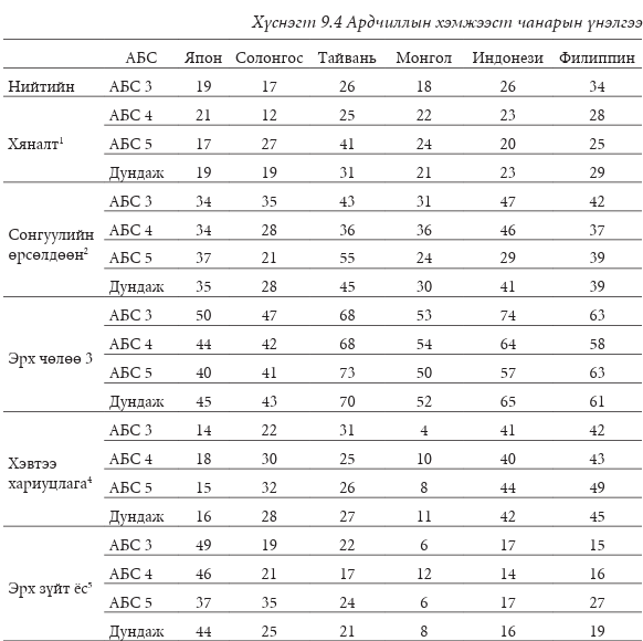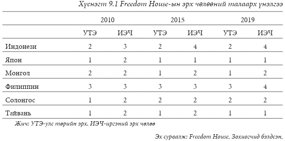 Freedom House жил бүр улс төрийн эрх, иргэний эрх чөлөөний талаарх улс орны өнөөгийн байдлыг 1 (хамгийн чөлөөтэй)-ээс 7 (хамгийн чөлөөгүй) хүртэлх шатлалаар мэдээлдэг. Хүснэгт 9.1-д үзүүлснээр 2019 онд Япон, Тайвань тус бүр 1, Монгол 1,5, Өмнөд Солонгос 2 дундаж оноо авчээ. Бүгдийг нь “чөлөөт” гэж ангилсан. Индонез 3, Филиппин 3.5 дундаж оноо авчээ. Тэд хоёулаа “хагас чөлөөтэй” гэсэн үнэлгээ авсан. Freedom House-аас эдгээр зургаан улсыг “сонгуульт ардчилал” гэж тодорхойлсон нь өрсөлдөөнт олон намын тогтолцоо, бүх нийтийн сонгуулийн эрх, байнгын өрсөлдөөнтэй сонгууль, улс төрийн томоохон намууд сонгогчдод тэгш оролцох зэрэг минималист ардчиллын шинж чанартай болохыг харуулж байна. Хүснэгт 9.1-ээс харахад сүүлийн 10 жилд Япон, Тайвань, Монголд дундаж зэрэглэл өссөн бол Өмнөд Солонгос, Индонези, Филиппинд буурсан байна. Тодруулбал, Индонезийн зэрэглэлийг “чөлөөт”-өөс “хагас чөлөөт” болгон бууруулжээ.