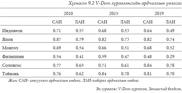 Ардчиллын тухай янз бүрийн үзэл баримтлалыг ялгахын тулд V-Dem хүрээлэн нь ардчиллын таван индексийг боловсруулсан. Сонгуульт ардчиллын индекс (САИ) нь бүх нийтийн сонгох эрх, чөлөөт, шударга сонгууль, олон намын өрсөлдөөн гэх мэт “нимгэн (thin)” ардчиллын шинж чанарыг онцолж өгдөг (Dahl 1971). Ардчиллын сонгуулийн зарчмыг төлөөллийн ардчиллын бусад үзэл баримтлалд ч чухал элемент гэж үздэг. Либерал ардчиллын индекс (ЛАИ) нь сонгуульт ардчиллын хэмжүүр дээр либерал эрхийг хамгаалах, хууль дээдлэх, бие даасан шүүх засаглал, гүйцэтгэх эрх мэдлийн хэрэгжилтийг хязгаарласан үр дүнтэй хяналт, тэнцвэрт байдлыг үүн дээр нэмдэг. Хүснэгт 9.2-т харуулснаар, 2019 онд Өмнөд Солонгос хамгийн өндөр САИ болон ЛАИ оноог үзүүлж араас нь Япон, Тайвань жагссан бол Филиппин хамгийн бага САИ болон ЛАИ оноог үзүүлэв. Freedom House жил бүр улс төрийн эрх, иргэний эрх чөлөөний талаарх улс орны өнөөгийн байдлыг 1 (хамгийн чөлөөтэй)-ээс 7 (хамгийн чөлөөгүй) хүртэлх шатлалаар мэдээлдэг. Хүснэгт 9.1-д үзүүлснээр 2019 онд Япон, Тайвань тус бүр 1, Монгол 1,5, Өмнөд Солонгос 2 дундаж оноо авчээ. Бүгдийг нь “чөлөөт” гэж ангилсан. Индонез 3, Филиппин 3.5 дундаж оноо авчээ. Тэд хоёулаа “хагас чөлөөтэй” гэсэн үнэлгээ авсан. Freedom House-аас эдгээр зургаан улсыг “сонгуульт ардчилал” гэж тодорхойлсон нь өрсөлдөөнт олон намын тогтолцоо, бүх нийтийн сонгуулийн эрх, байнгын өрсөлдөөнтэй сонгууль, улс төрийн томоохон намууд сонгогчдод тэгш оролцох зэрэг минималист ардчиллын шинж чанартай болохыг харуулж байна. Хүснэгт 9.1-ээс харахад сүүлийн 10 жилд Япон, Тайвань, Монголд дундаж зэрэглэл өссөн бол Өмнөд Солонгос, Индонези, Филиппинд буурсан байна. Тодруулбал, Индонезийн зэрэглэлийг “чөлөөт”-өөс “хагас чөлөөт” болгон бууруулжээ. Ардчиллын тухай янз бүрийн үзэл баримтлалыг ялгахын тулд V-Dem хүрээлэн нь ардчиллын таван индексийг боловсруулсан. Сонгуульт ардчиллын индекс (САИ) нь бүх нийтийн сонгох эрх, чөлөөт, шударга сонгууль, олон намын өрсөлдөөн гэх мэт “нимгэн (thin)” ардчиллын шинж чанарыг онцолж өгдөг (Dahl 1971). Ардчиллын сонгуулийн зарчмыг төлөөллийн ардчиллын бусад үзэл баримтлалд ч чухал элемент гэж үздэг. Либерал ардчиллын индекс (ЛАИ) нь сонгуульт ардчиллын хэмжүүр дээр либерал эрхийг хамгаалах, хууль дээдлэх, бие даасан шүүх засаглал, гүйцэтгэх эрх мэдлийн хэрэгжилтийг хязгаарласан үр дүнтэй хяналт, тэнцвэрт байдлыг үүн дээр нэмдэг. Хүснэгт 9.2-т харуулснаар, 2019 онд Өмнөд Солонгос хамгийн өндөр САИ болон ЛАИ оноог үзүүлж араас нь Япон, Тайвань жагссан бол Филиппин хамгийн бага САИ болон ЛАИ оноог үзүүлэв.