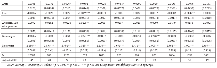 Хүснэгт 10.3-т тооцоолсон үр дүнг харуулав. Хүснэгт 10.1, Хүснэгт 10.2ыг давтан Загвар 1 нь улс орон бүрийн онцлог болон кластер стандарт алдааг нэгтгэсэн түүврийн нэгдсэн үр дүнг харуулж байна. Мөн Загвар 2-оос Загвар 11-д улс орон бүрийн тооцоолсон үр дүнг харуулав. Бидний харж байгаагаар авлигын талаарх ойлголтын коэффициентүүд бүх загваруудад сөрөг гарч буй бөгөөд мэдэгдэхүйц байна. Коэффициентийн хэмжээ нь авлига болон байгууллагын итгэлцэл хоёрын хооронд мэдэгдэхүйц байгаа бөгөөд хамаарал ихтэй байгааг 128 | Шинэ толь №86харуулж байна. Урьдчилсан судалгааны дүн шинжилгээгээр төсөөлж буй авлигын байдал, өнөөгийн эдийн засгийн үнэлгээ, ардчиллын сэтгэл ханамж зэрэг нь иргэдийн институцийн итгэлд нөлөөлөх хамгийн чухал хөдөлгөгч хүчин зүйл болохыг харуулж байна. Товчхондоо, эндээс гарсан дүр зураг нь Чан, Чу нарын судалгааг баталж байгаа бөгөөд улс төрийн авлига нь институцийн итгэлцлийг “ялзруулах” нөлөө үзүүлж байгааг дахин нотолж байна.