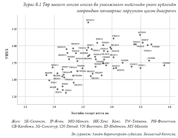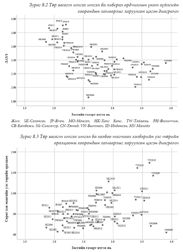 Эхлээд институцид итгэх итгэл ба үнэт зүйлсийн хоорондын хамаарал улс төрийн оролцооны хоёр хэлбэртэй хэрхэн уялдаж өөрчлөгдөхийг авч үзье. Үүний тулд улс орон, бүс нутаг бүрийн АБС-ны давтамжит судалгаанд суурилсан нийлбэр өгөгдлийн цэгэн диаграммыг харцгаая. Зураг 8.1 нь төв засгийн газарт итгэх итгэл нэмэгдэхийн хэрээр уламжлалт нийгмийн үнэт зүйлсийн нийтлэг чиг хандлага өсөж байгааг харуулж байна2. Харин зураг 8.2 нь эсрэгээрээ, төв засгийн газарт итгэх итгэл буурах тусам либерал ардчиллын үнэт зүйлс нэмэгдэж байгааг үзүүлж байна. Нөгөөтэйгүүр, институцид итгэх итгэл нь улс төрийн оролцоотой тодорхой хамааралтай байна. Зураг 8.3 ба 8.4-аас үзэхэд холбоо тогтоох хэлбэрийн улс төрийн оролцоо нь засгийн газарт итгэх итгэлтэй эерэг хамааралтай, харин идэвхтэй хэлбэрийн улс төрийн оролцоо нь түүнтэй сөрөг хамааралтай байна. Эдгээр зурагт үндэслэн дараах дүгнэлтийг хийж болох юм: Холбоо тогтоох хэлбэрийн төрийн байгууллагын улс төрийн оролцоо нь уламжлалт нийгмийн үнэт зүйлсийг тусгаж байхад, идэвхтэй хэлбэрийн улс төрийн оролцоо нь либерал ардчиллын үнэт зүйлсийн хандлагатай нийцэж байна. Өөрөөр хэлбэл, холбоо тогтоох хэлбэрийн улс төрийн оролцоо нь улс төрийн нөлөө бүхий хүмүүстэй харилцахад илүү нийцтэй бөгөөд уламжлалт үнэт зүйлсээр дэмжигддэг, иргэдийн хооронд (эрх мэдэлтэй болон эрх мэдэлгүй) зэрэг дэвийн шаталсан харилцаа (hierarchical) байж болохыг илэрхийлж байна. Харин идэвхтэй хэлбэрийн улс төрийн оролцоо нь либерал ардчиллын үнэт зүйлсээр өдөөгдсөн үйлдлээр дамжуулан итгэл даахгүй засгийн газрыг шахах зорилготой мэт харагдаж байна.
