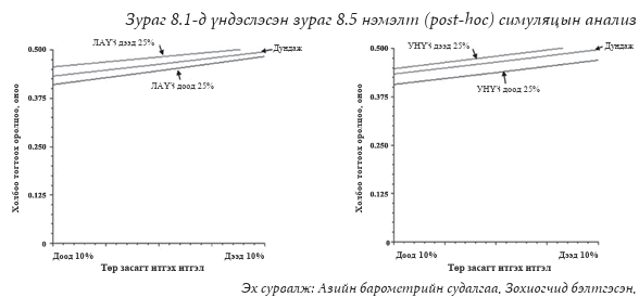 Идэвхт хэлбэрийн улс төрийн оролцооны үр дүнг Хүснэгт 8.2 болон Зураг 8.6д үзүүлэв. Графикууд нь харилцан үйлчлэл бүхий нэмэлт (post hoc) симуляцийн аргаар үр дүнг дүрсэлж байна.