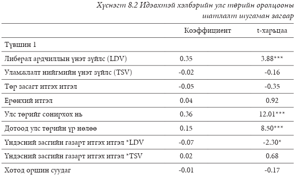 Харилцан үйлчлэлийн нөлөөний хувьд төр засагт итгэх итгэл ба либерал ардчиллын үнэт зүйлсийн нөлөө нь сөрөг бөгөөд статистикийн хувьд ач холбогдолтой байв. Зураг 8.6 (зүүн хэсэг) нь таамагласны дагуу либерал ардчиллын үнэт зүйлс болон төр засагт итгэх итгэлийн хоорондын хамаарал, өөрөөр хэлбэл уг итгэлцэл бага байх ба либерал ардчиллын үнэт зүйлс хүчтэй байх нөхцөл нь идэвхт хэлбэрийн улс төрийн оролцоог өдөөж байгааг харуулж байна. Харин эсрэгээрээ, либерал ардчиллын үнэт зүйлс сул байхад улс төрийн оролцоо төр засагт итгэх итгэлийн түвшнээс үл хамааран доогуур хэвээр байна. Нэмж дурдахад, уламжлалт нийгмийн үнэт зүйлийн дан нөлөө болон төр засагт итгэх итгэлтэй харилцан үйлчлэлийн нөлөө аль аль нь илрээгүй (Зураг 8.6 баруун хэсэг).