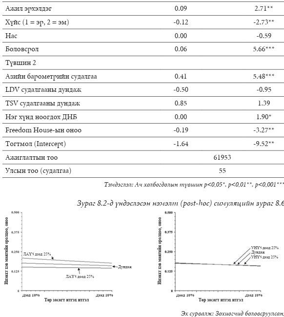 - удалгааны нөлөөний хувьд ч мөн адил шалтгааны улмаас холбоо тогтоох хэлбэрийн улс төрийн оролцооны шинжилгээнд гарсан шиг статистикийн ач холбогдолтой дүн илэрсэн. ↩︎